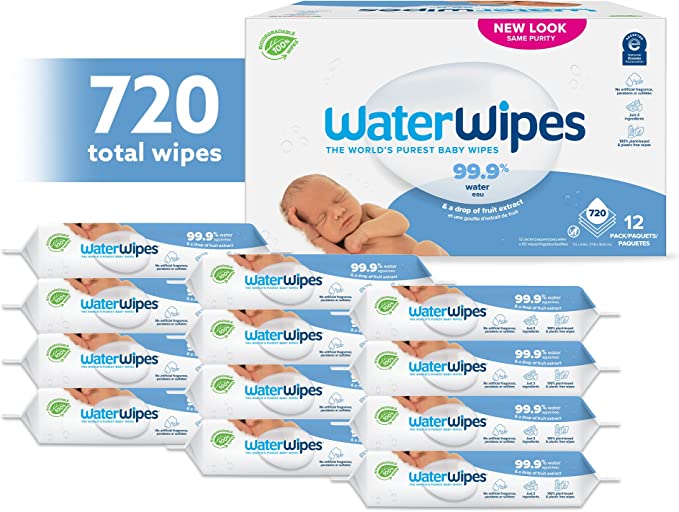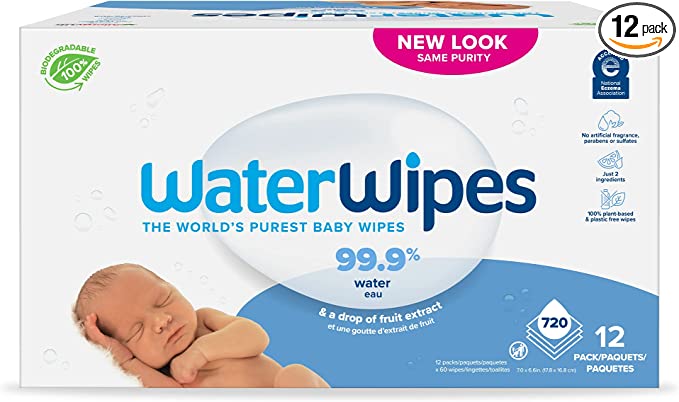 WaterWipes Biodegradable Original Baby Wipes, 99.9% Water Based Wipes, Unscented & Hypoallergenic for Sensitive Skin, 60 Count (Pack of 12) – Packaging May Vary